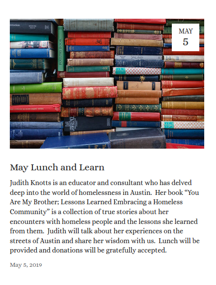 Speaker for May Lunch & Learn at University United Methodist Church